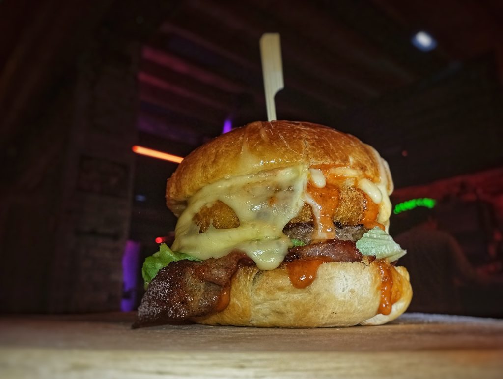 Pain boulanger, viande au choix (steak bœuf 150g, steak poulet, végétarien) sauce burger, reblochon, lard grillé, oignons confits, galette de pommes de terre, salade, tomate, servi avec frites maison